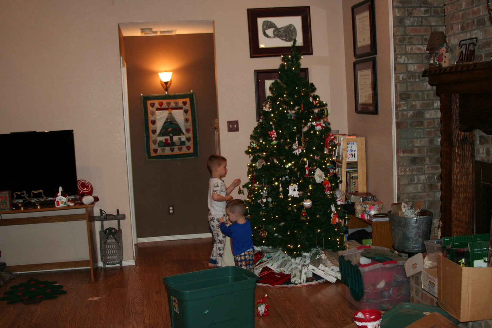 Dad and the boys in front of the tree. We did the twelve days of Christmas with the boys where each boy had something to open the twelve days before Christmas so that the big day would not be so overwhelming. The boys and dad with day 1 presents in their hands. They were a little disappointed as it was another ornament for the tree. Each year they get a new one with their name and year on it. Maybe one day they will appreciate them, right now . . . not so much!